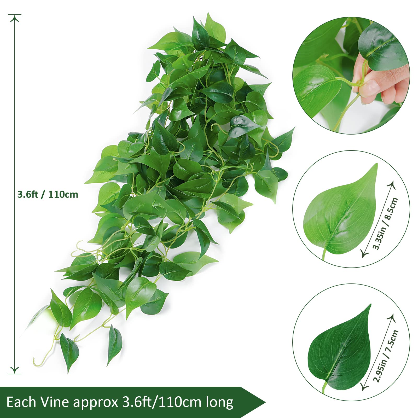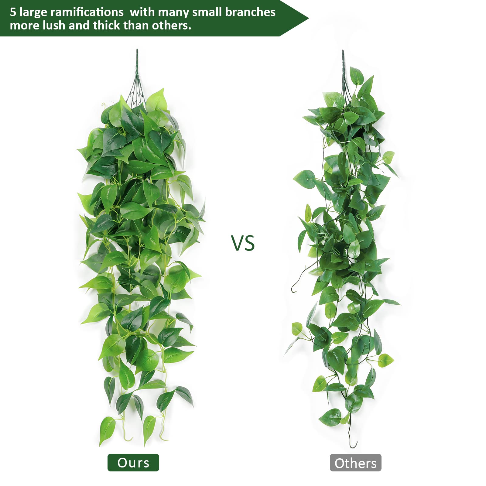 - 【PACKAGE INCLUDES】 – 2 packs of green artificial hanging plants. Each fake ivy vines has five ramifications, and below of which there are many smaller branches, that makes the vines looks lush and thick. Each branch has a different length. The longest vine is about. 3.6 feet/110cm.