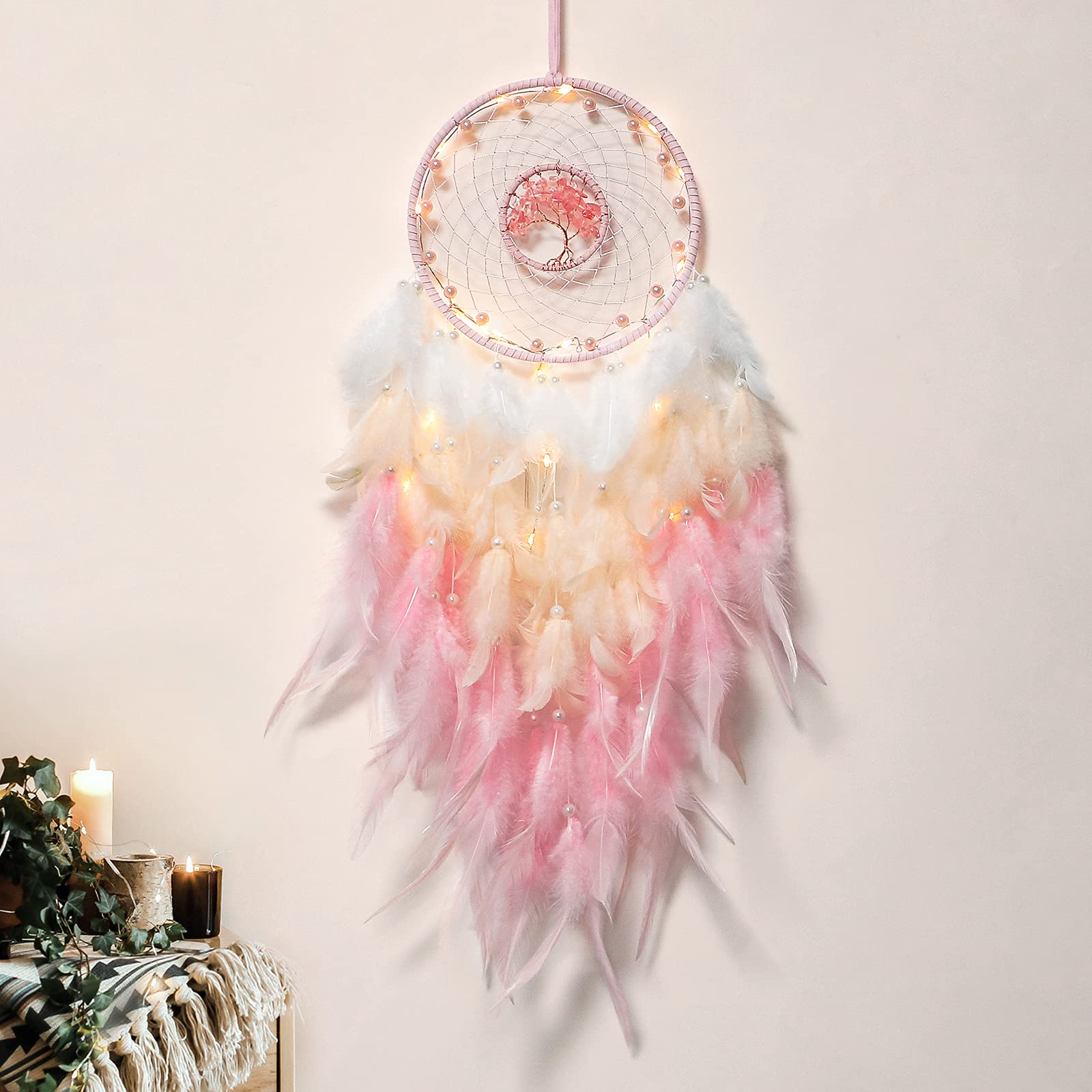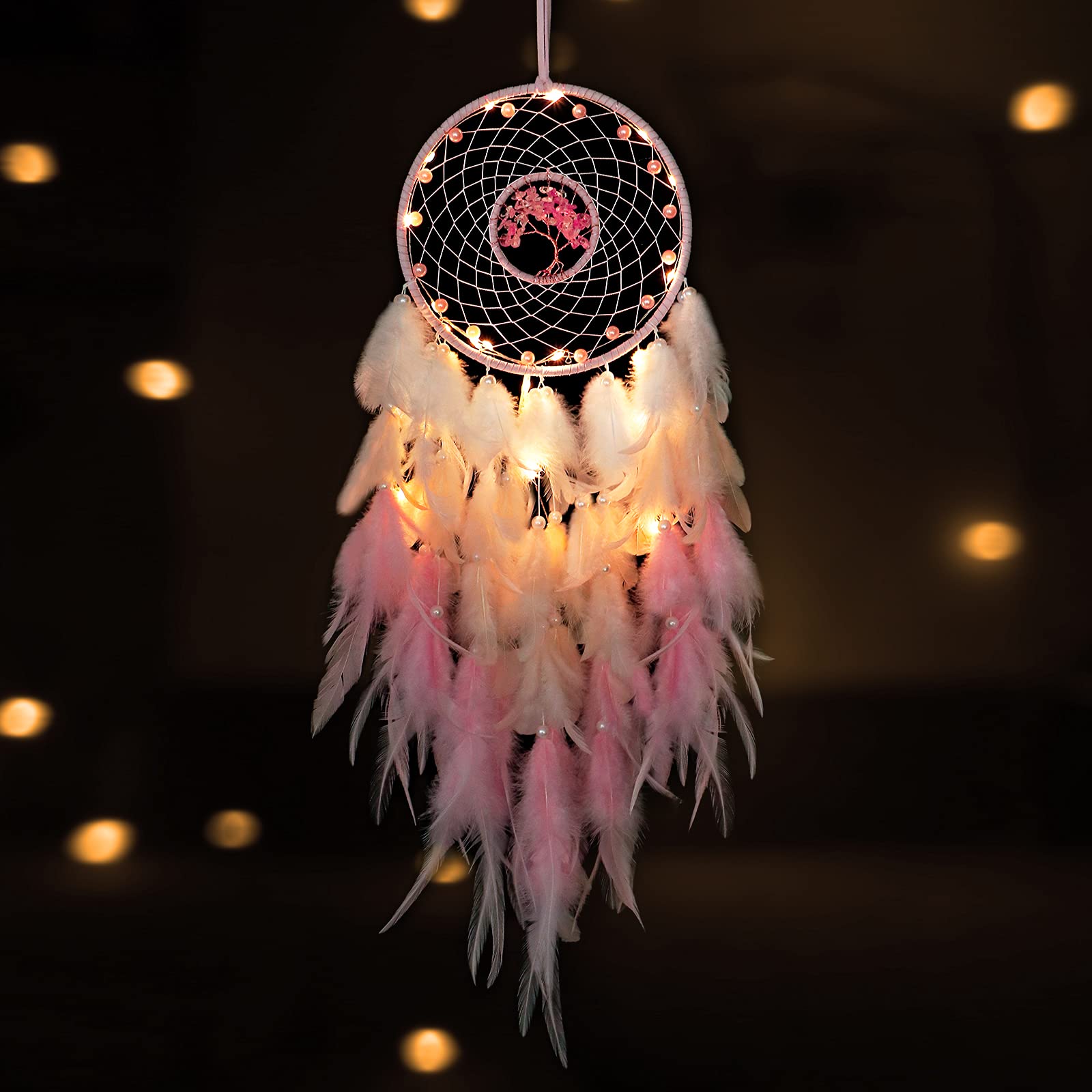 - 【SIZE&QUALITY】: Diameter: 16cm/6.3 inch, total length: 48cm/19 inch. This Light Up Dream Catcher is totally handmade with soft natural feathers, metal circle, elegant beads and gorgeous resin pendant.