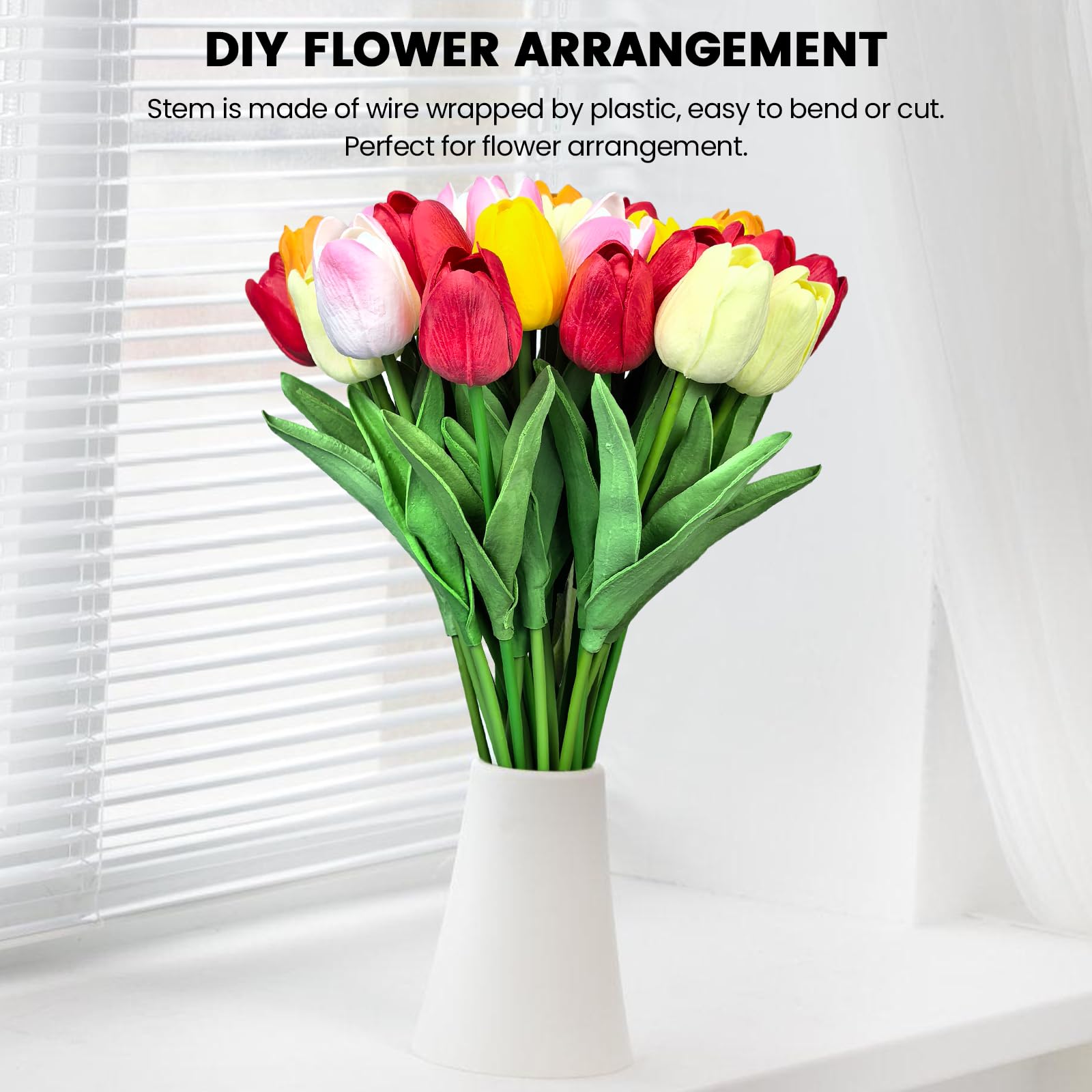 - Materials: Flower is made of soft Polyurethane (PU), the texture is soft and skin friendly, providing a real touch sensation. The stems of tulips are made of metal wire wrapped by plastic, which is soft, easy to bend or cut.