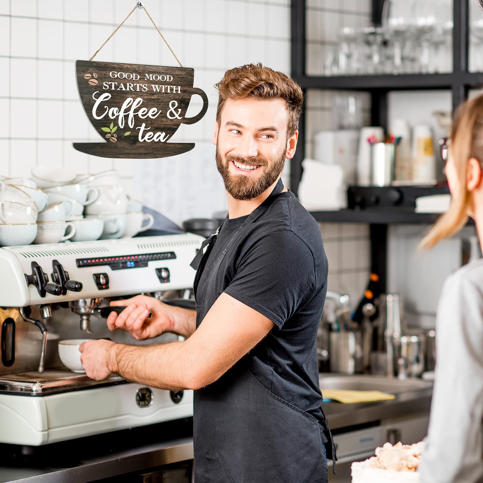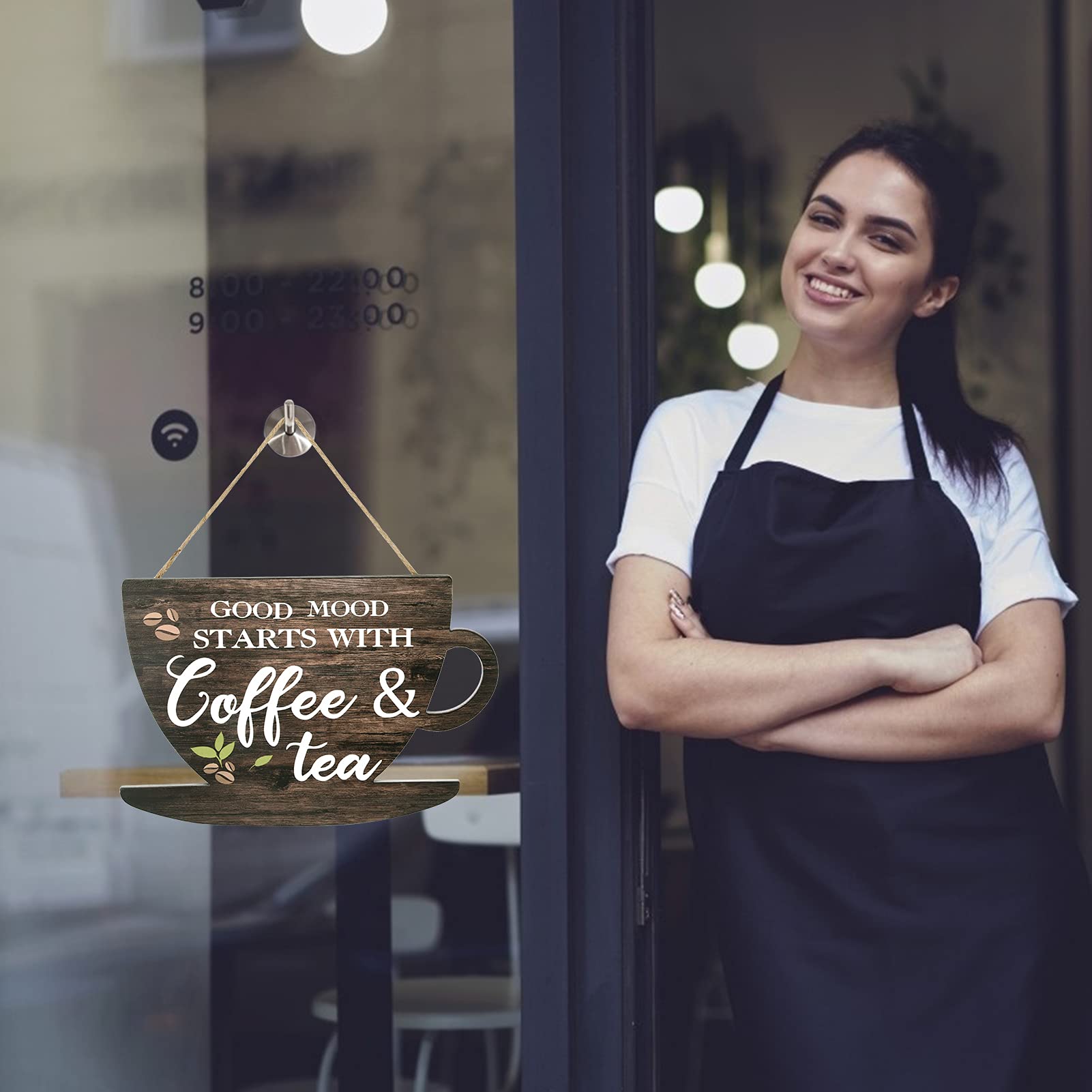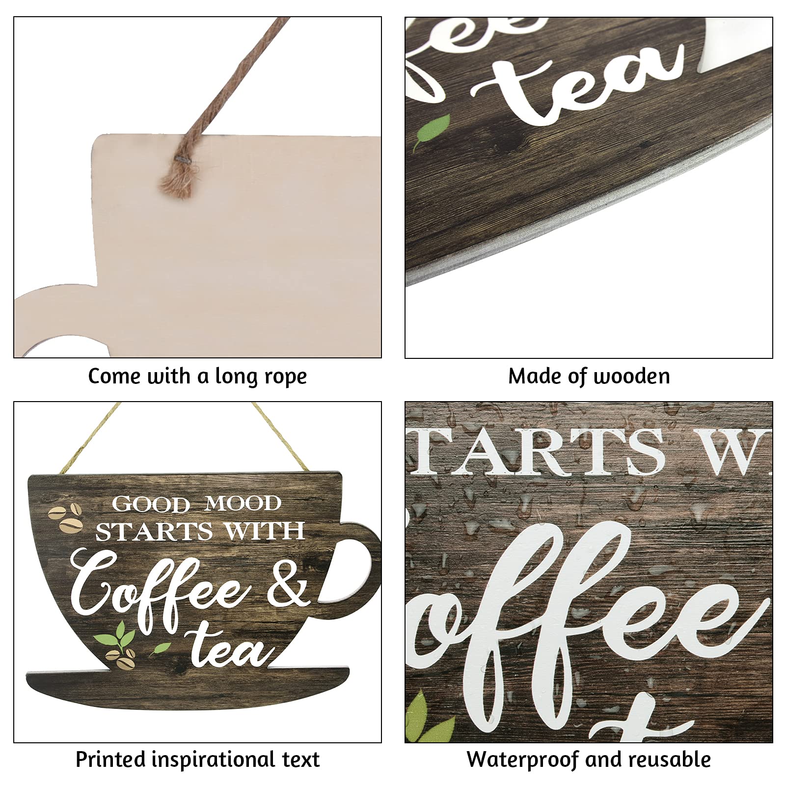 - QUALITY ARTCRAFT: 12.6 x 11.8 inch(L*W), 0.24 inch thickness, Coffee & Tea sign is expertly crafted from solid wood, featuring a trendy, weathered finish. Single side printed with artistic words “GOOD MOON STARTS WITH COFFEE & TEA”.